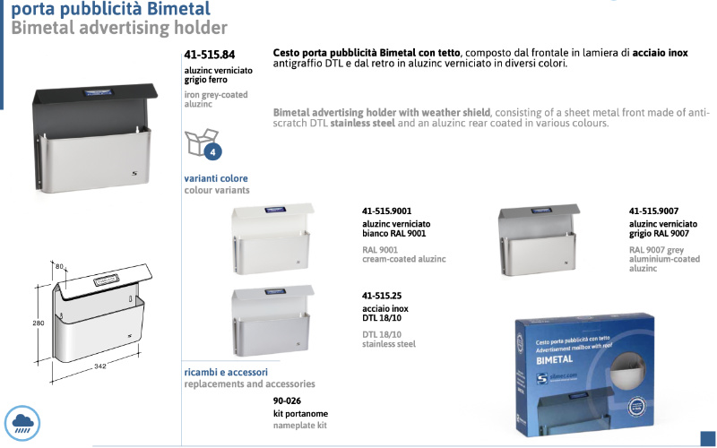 advertising basket with roof, composed of the front in DTL scratch-resistant stainless steel sheet and the back in aluzinc painted in different colors.