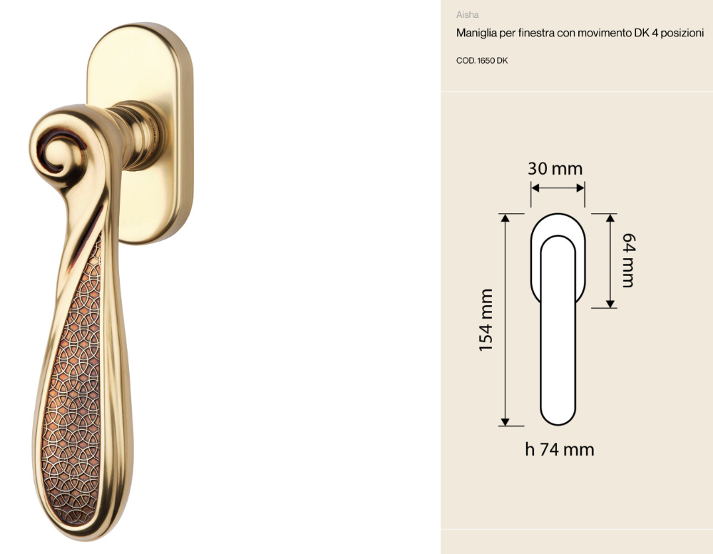 Choose Aisha if you want a window handle that combines decorative design, quality construction, and everyday practicality; order your favorite finish on Windowo and complete your windows with a touch of Arabian charm.