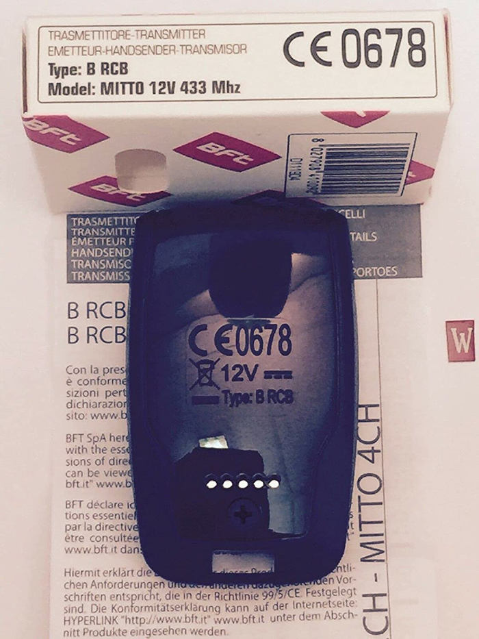 The range of the Bft MITTO remote control is 50/100 m. The power supply is 12 V with 1 23 A battery.