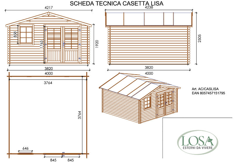 The house is supplied with bituminous felt which, if correctly assembled, guarantees a duration of approximately two/three years, therefore it is advisable to purchase and waterproof the house with a long-lasting covering such as bituminous tiles, corrugated roofing, slated sheath, etc.