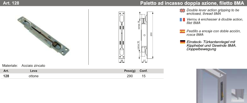 The model code Nova-Ferr 128 is a double action recessed bolt with brass lever and 8MA thread. Here are the measures: