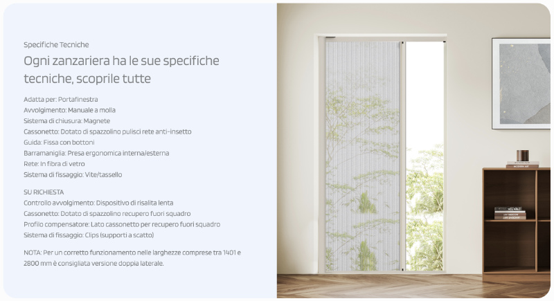 Made in Italy, this mosquito net stands out for its slim and discreet design, with a box of only 50mm, which integrates harmoniously into various living contexts without creating bulk.