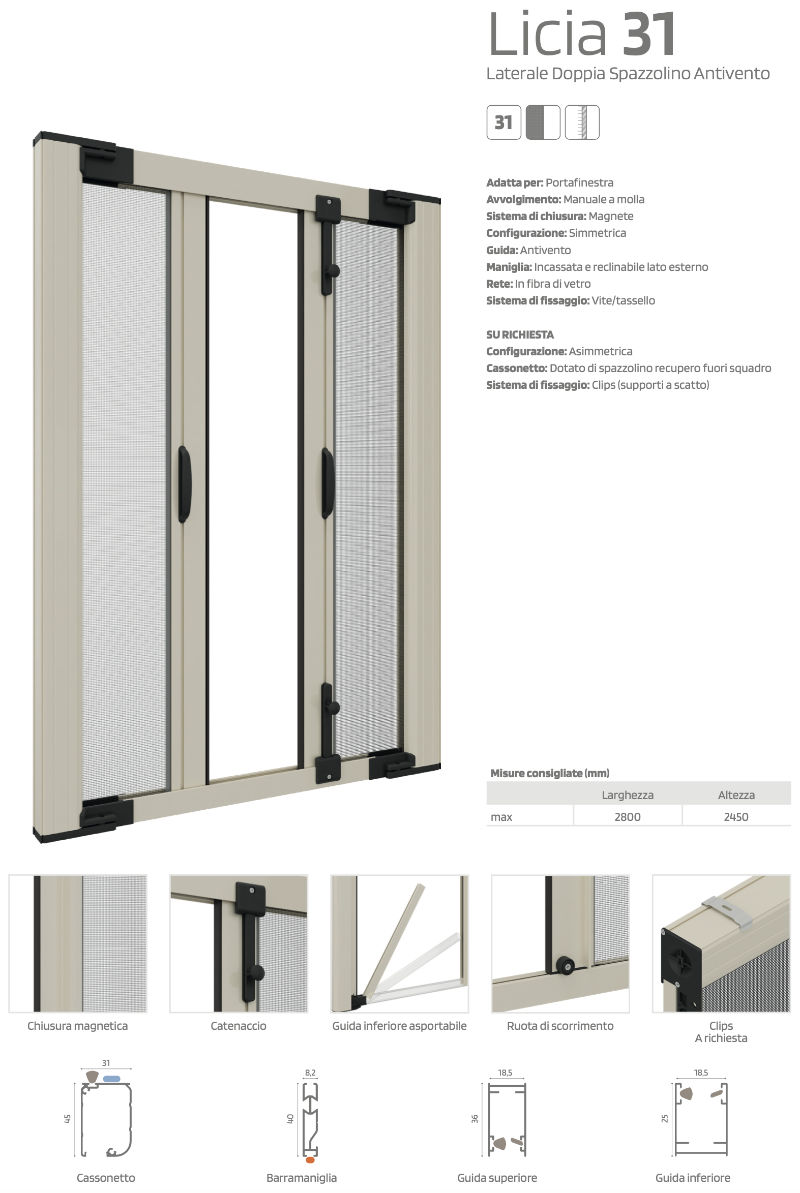 Licia mosquito nets, designed to blend perfectly with the context in which they are inserted, offer a wide selection of colors for their profiles, thus offering the possibility of customizing according to different tastes and styles. Strong and functional, they are designed to resist over time, ensuring long life and constant reliability.