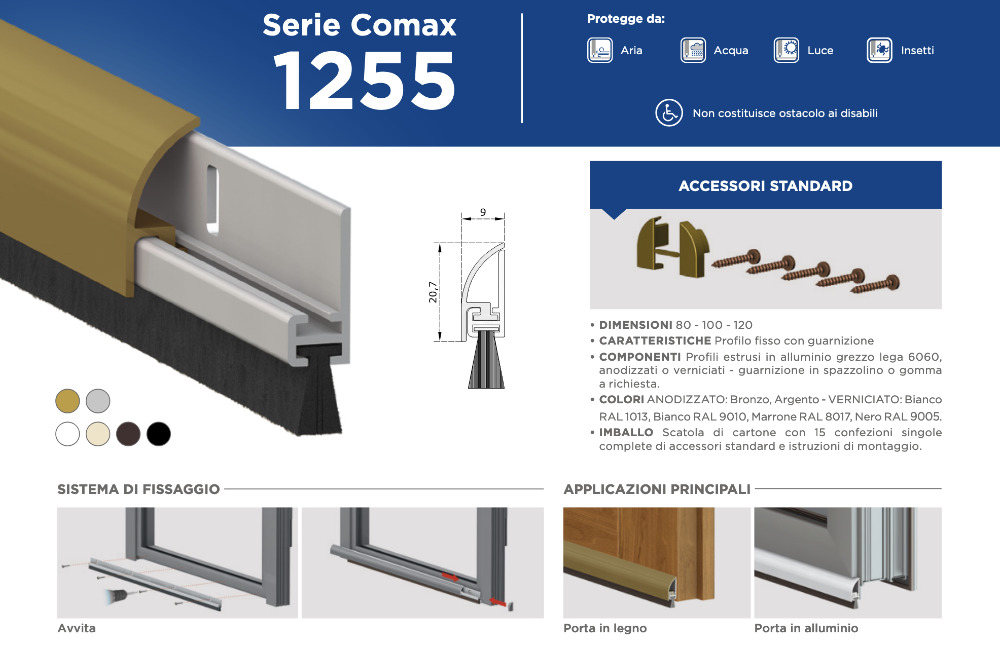 The Comaglio model 1255 fixed draft excluder from the Comax series is designed to be used as a do-it-yourself solution for doors. You can fix it to the door using screws to ensure proper installation.