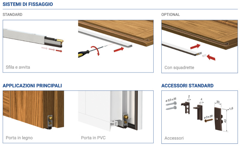 The Comaglio draft excluder is a patented automatic system which, when the door is closed, automatically blocks the possibility of cold, dust and noise invading our environment.