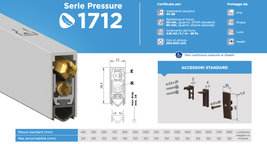 The Comaglio 1712 draft excluder is a patented automatic system that blocks the entry of cold, dust and noise when the door is closed, guaranteeing a comfortable and protected internal environment. It is suitable for armored, wooden and PVC doors. The double register mechanism (DR) ensures a reliable automatic closure.