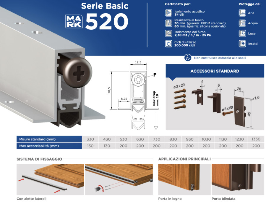 Comaglio 520 Basic Series draft excluder, the ideal solution to protect your environment from light, insects, water, air and noise, with acoustic insulation of 34 dB.