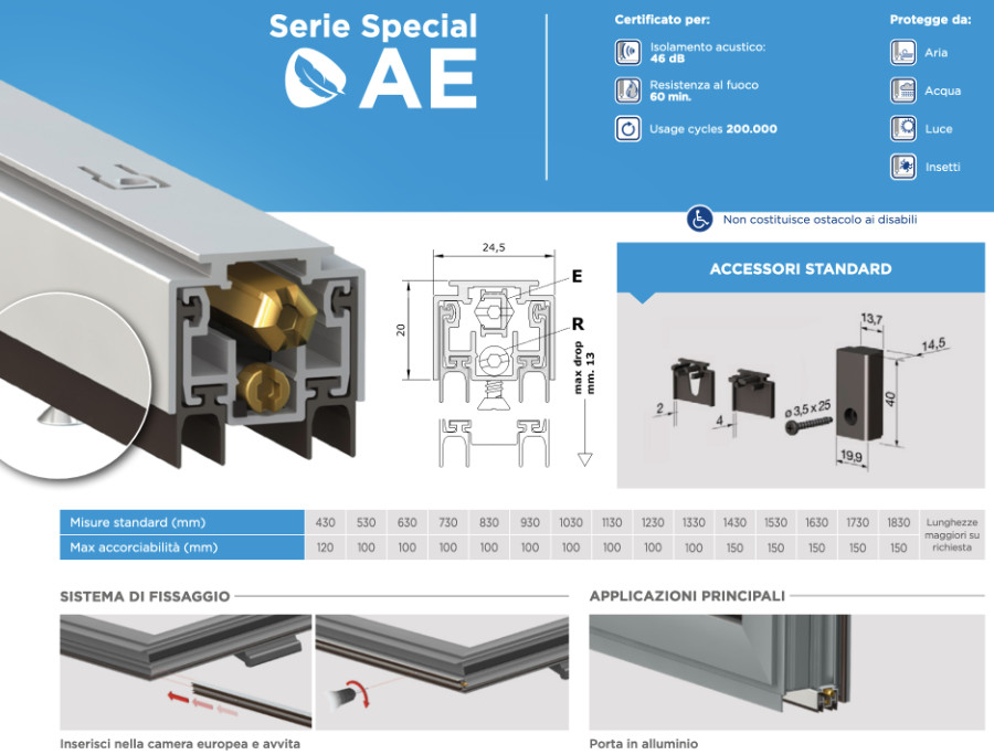 Comaglio AE Special Series draft excluders, equipped with a patented mechanism that allows the parallel descent of the mobile profile with gasket.
