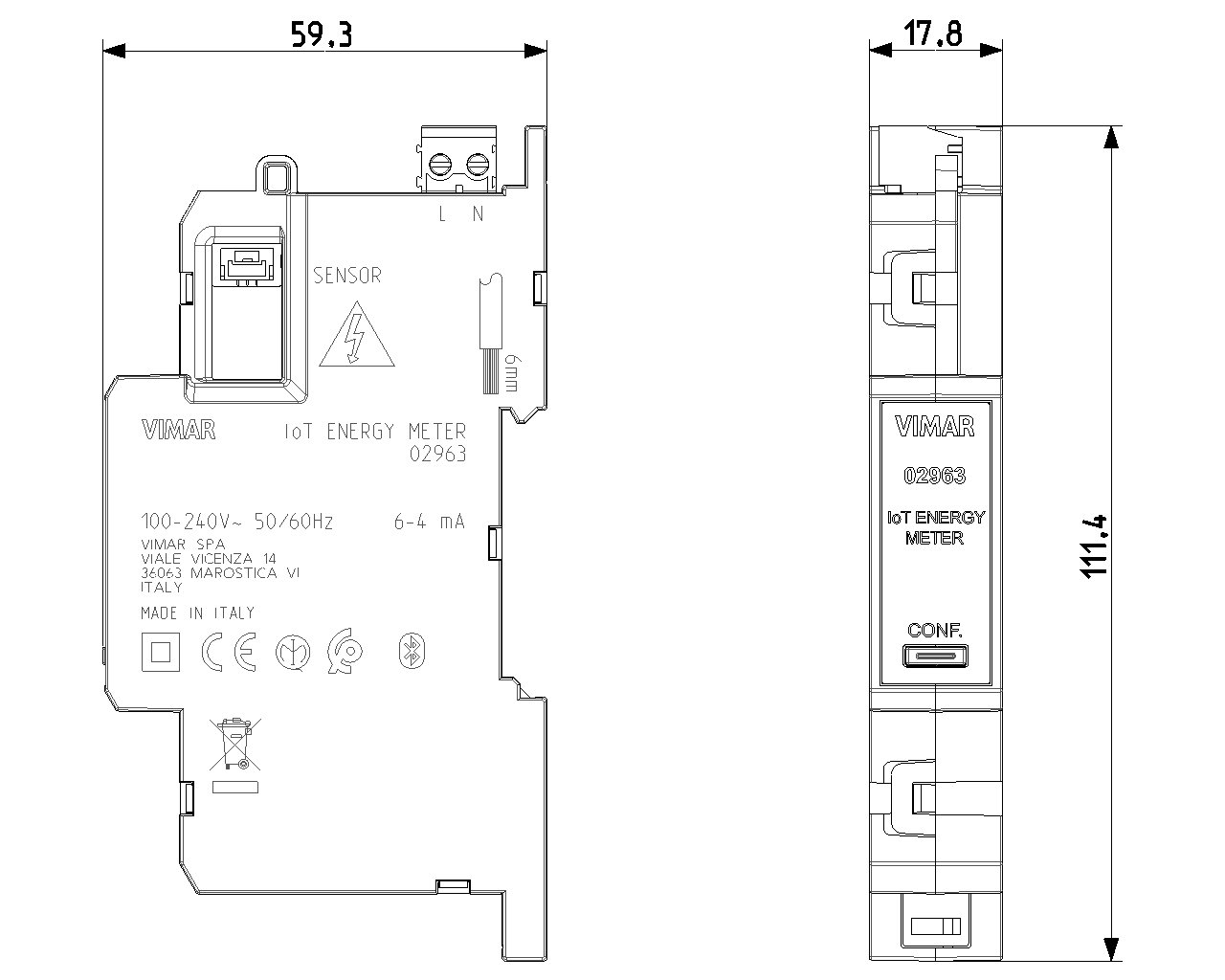 Technical drawing Energy Meter Connected Single-phase IoT Device Connected Vimar: