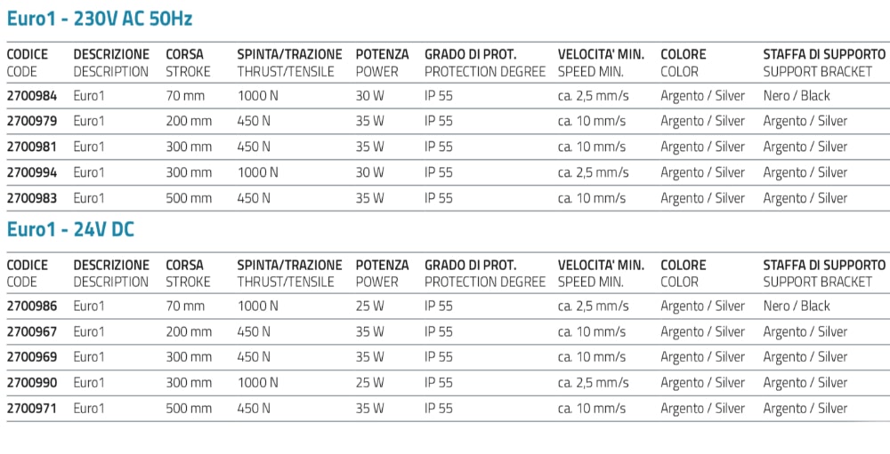 Euro 1 Mingardi Attuatore Elettrico Lineare a Stelo Rigido
