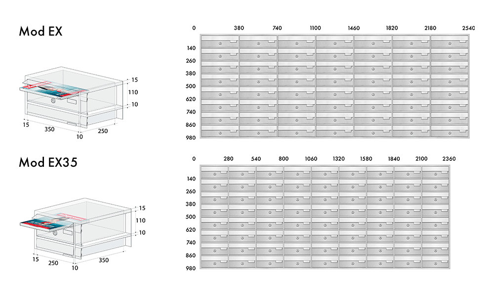 To contain advertising and prevent it from being dispersed in the entrance, integrated advertising boxes can be created with single, double or triple dimensions compared to the standard boxes, inserted harmoniously in the design of the filing cabinet.
