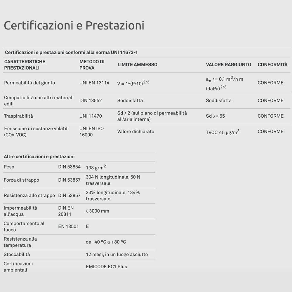 - Breathability (UNI 11470): Sd <= 0.05 COMPLIANT