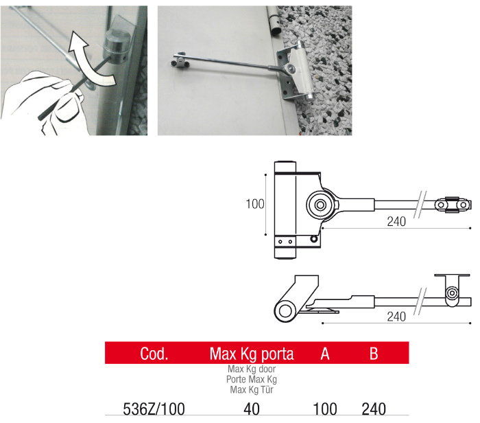 Hinge with door closer : measurements and technical characteristics are indicated below.