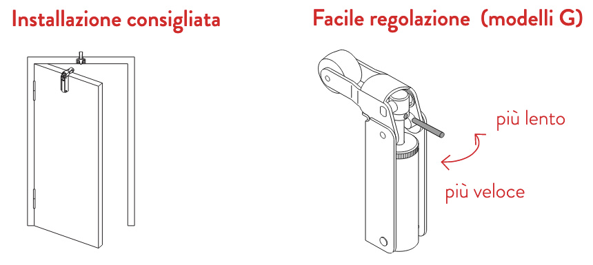 The door brake has the possibility of adjusting the closing speed from 1 to 10 seconds (only for models with adjustable closing).