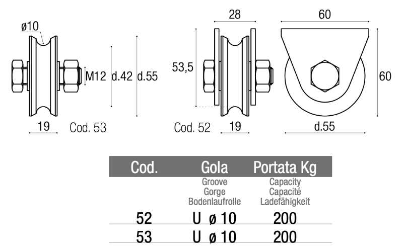 Below, there is a table with codes that correspond to the wheels shown, followed by "Groove", which refers to the part of the wheel that fits into the groove or track. The term "Load Capacity Kg" refers to the load capacity of the wheel in kilograms, which is 200 kg for both models.