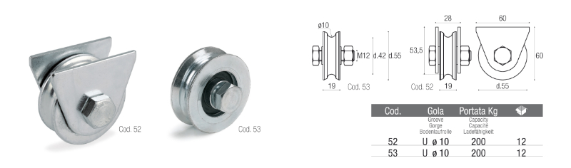 The wheel coded as 52 has a V-shaped mount that allows installation in a groove or on a track, while the wheel coded as 53 has a flat mount. The technical drawings show specific wheel measurements, such as outside diameter, center hole diameter, and other measurements relevant to installation and use.