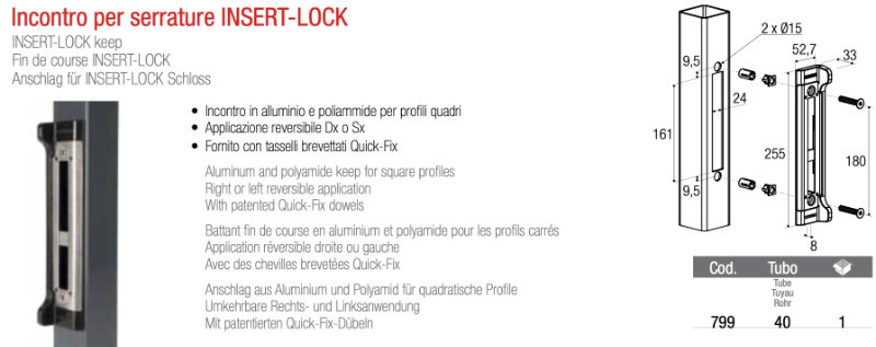 Ideal for installation in environments that require high security, such as gates, doors of residential and industrial buildings. The INSERT-LOCK lock with strike code 799 is an excellent choice for those looking for a reliable and long-lasting solution.