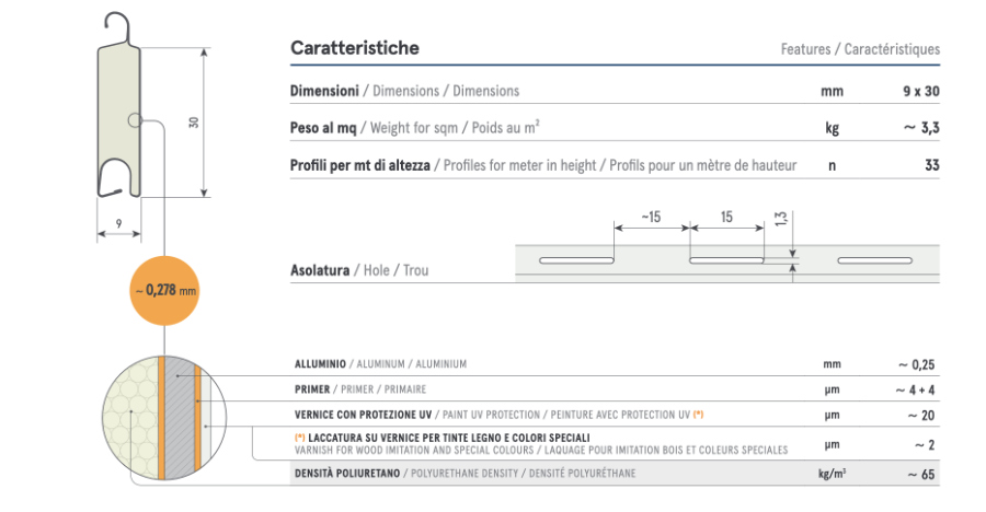Dimensions: mini flat profile measuring 9x30 mm, light and resistant with a weight of approximately 33 kg/m2.