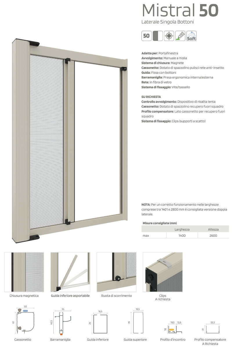 Lateral Sliding Mosquito Net - Mistral Officine Rami - Dimensions 50mm