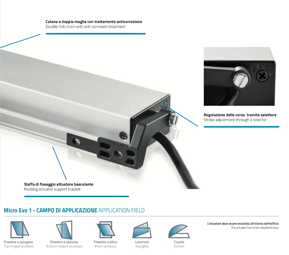 Micro Evo 1 Mingardi Double Link Chain Actuator for Top Hinged or Vasistas Windows