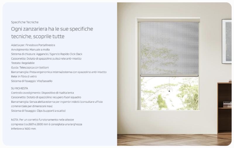 fiberglass mesh, the mosquito net ensures strength and durability, as well as offering effective protection against insects. The fixing system with screw and dowel completes the picture, ensuring a safe and stable assembly.