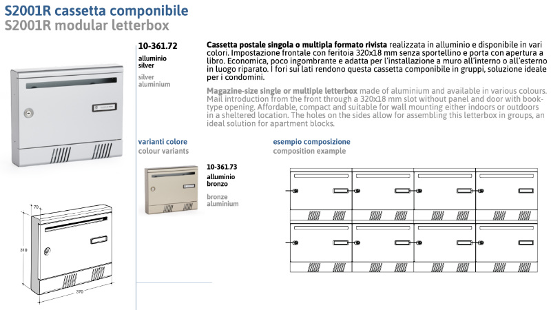 - S2001R series modular mailbox with dimensions 370 x 310 x 70 mm;