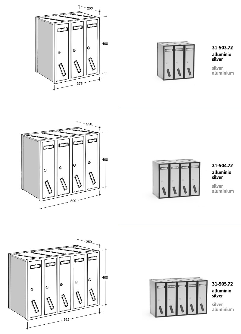 Mailbox of variable dimensions , made up of a variable group of magazine-sized boxes (3/4/5) and complete with aluminum cladding on all 4 sides, in the same color as the doors.