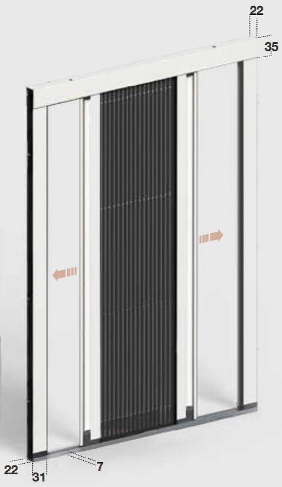 0.22 is a mosquito net with pleated net, clutch control. Its peculiar structure, characterized by two sliding profiles that allow the packaging and the total extension of the network from both sides, making it very suitable in combination with the sliding frames.