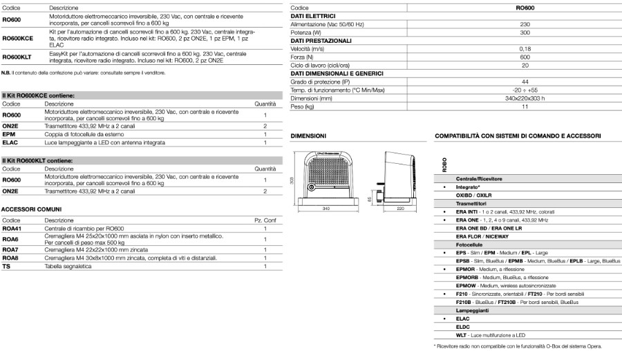 Kit for the automation of sliding gates up to 600 kg. 230 Vac, built-in control unit, built-in radio receiver. Included in the kit: RO600, 2 pcs ON2E, 1 pcs EPM, 1 pcs ELAC.
