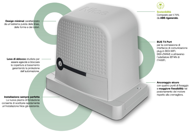 - Easy to install: thanks to compatibility with previous Nice models and the presence of horizontal and vertical adjustment systems.