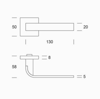 lever handle with 90° bent flat, R=20, on square rose with return spring. Lever handle shape, length 130 mm x 20 mm.