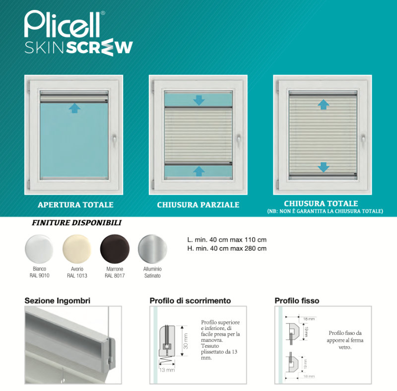 After this procedure, the Skin Screw pleated blind is free to slide at full height and to vary the light through the special shaped profile.