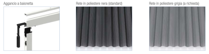 It is available in a wide range of solid colors, faux wood and metallics (raffaello). Practical and quick to install, available with black fiber mesh (standard), or in gray fiber (on request). The new colored sheets on request are innovative.