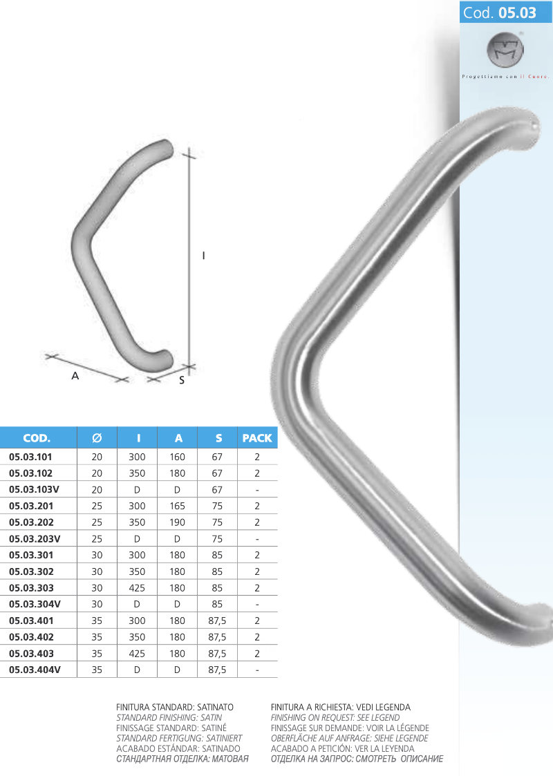 Handle in satin, polished or painted AISI 316L stainless steel (select the variant you want), produced in Italy by the company MPM (code 05.03).