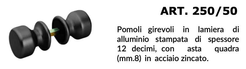 Revolving knobs in pressed aluminum sheet 12/10 thick, with 8 mm square rod in galvanized steel.