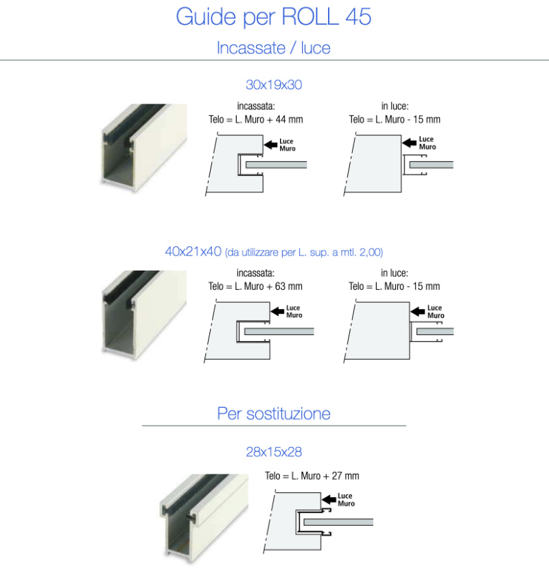 - Replacement or new installation of the roller shutter and the sliding guides : for the width of the roller shutter, with reference to the guides to be used, the necessary tolerances must be applied.
