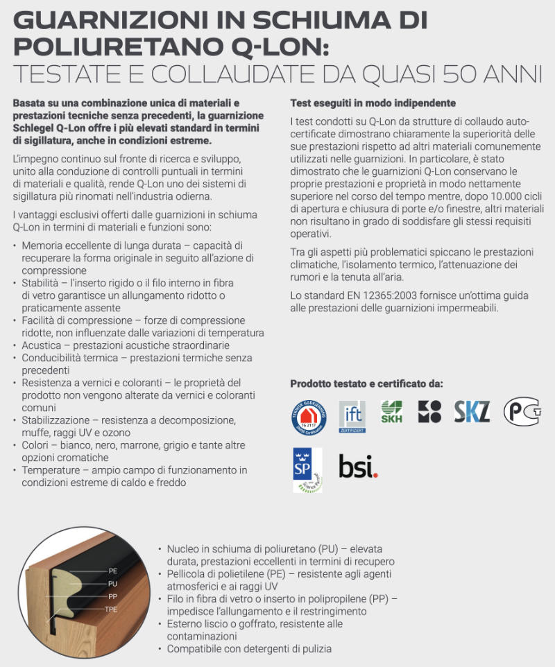 Compliant with the EN 12365:2003 standard , Q-LON gaskets are the ideal choice for those looking for air and water tightness, thermal insulation and noise reduction, with a certified and long-lasting product.