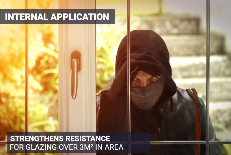 Reflectiv SEC 054 film prevents glass from shattering in the event of an explosion or vandalism in places such as shops, shopping centres, schools, hospitals, public buildings, exhibition halls, sports facilities, homes, etc.