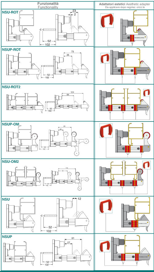 - NSUP-ROT : door stop with anti-scratch roller with extension. Work on the thickness of the door profile;