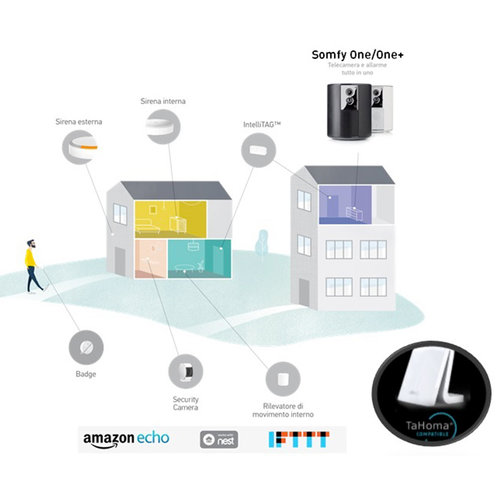 - Somfy One+ is compatible with the whole range of Somfy Protect accessories: IntelliTAG ™, internal motion detector, external siren, internal siren, badge and Security Camera.