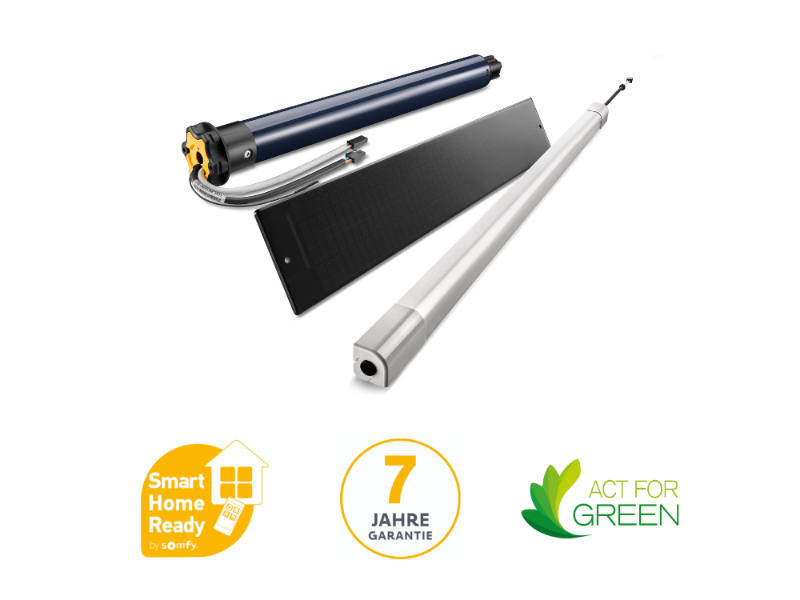 Somfy RS100 Solar io , motor for wireless solar shutters. The RS100 Solar io solar roller shutter motor is equipped with intelligent functions and the new solar roller shutter drive system.
