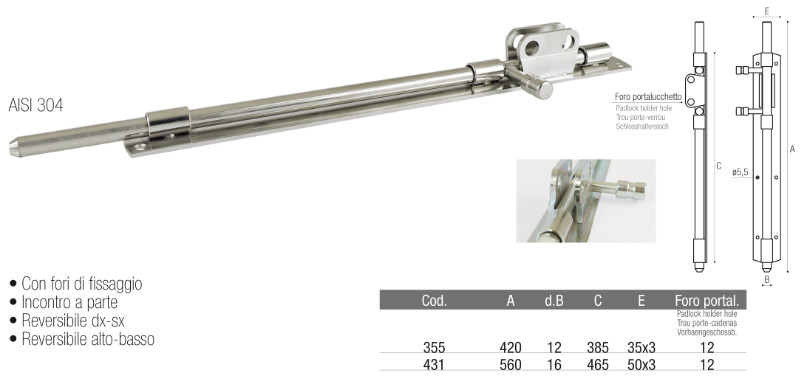 Stainless Steel Bolt - Vertical, Reversible and Without Keep