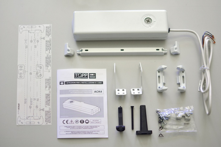 Included in the package: chain actuator, fixed front mounting bracket, vasistas bracket, connection to the window frame with pin and small parts package.
