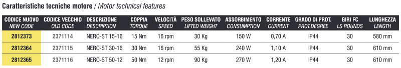 - Code: 2812365 - NERO-ST 50-12 - Torque 50 Nm - Speed 12 rpm - Raised weight 90 Kg - Absorption 270 W - Current - 1.20 A - Protection degree IP44 - FC 30 rpm - Length 610 mm.