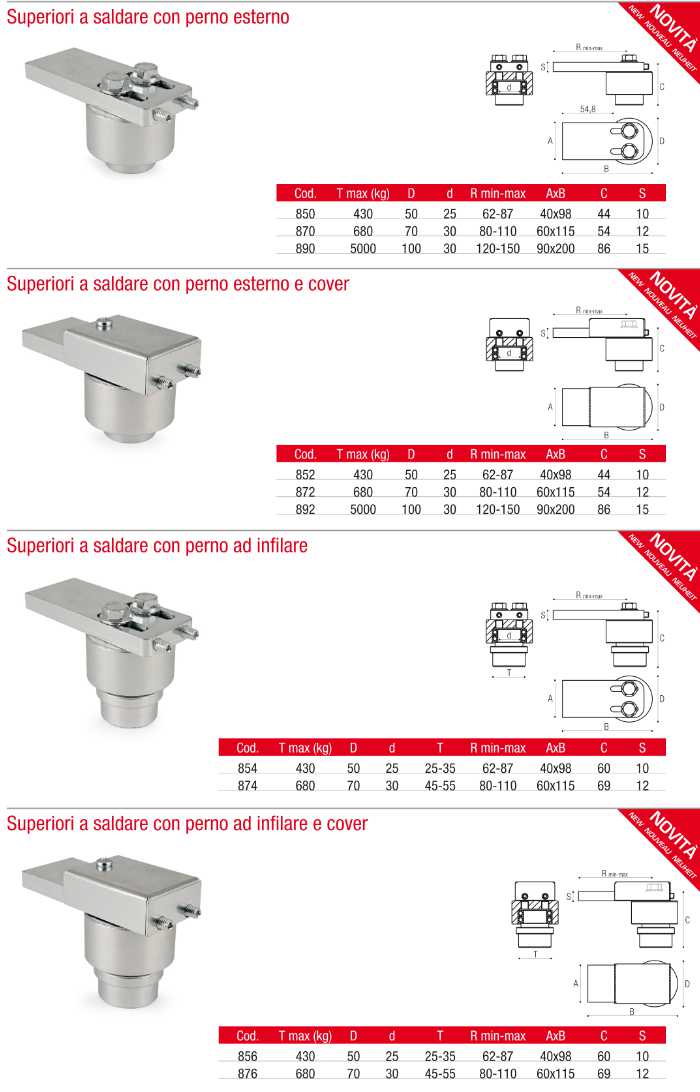 - Upper hinges to be welded with external pin and cover (codes 852, 872, 892);