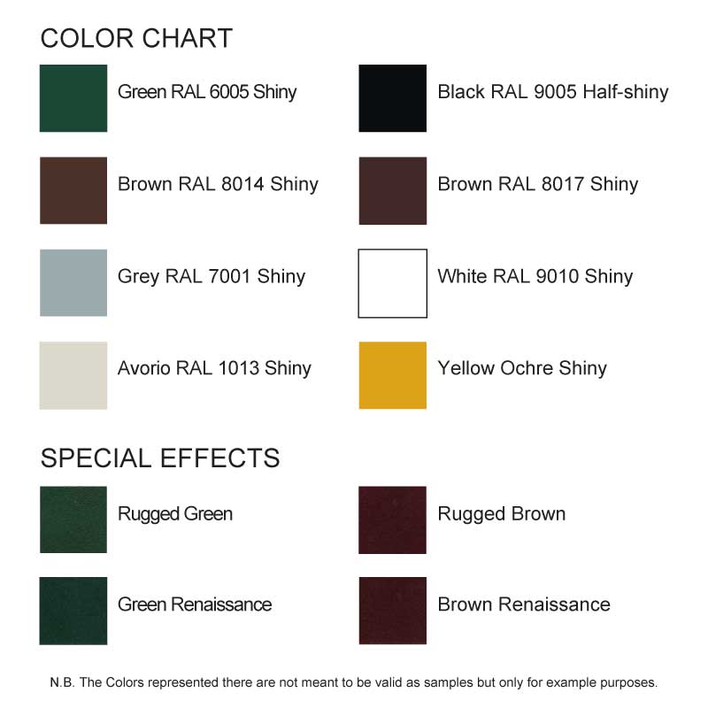 powder coating in a wide range of colors available. This procedure, unlike liquid paint, guarantees long life of the material and requires very little maintenance.
