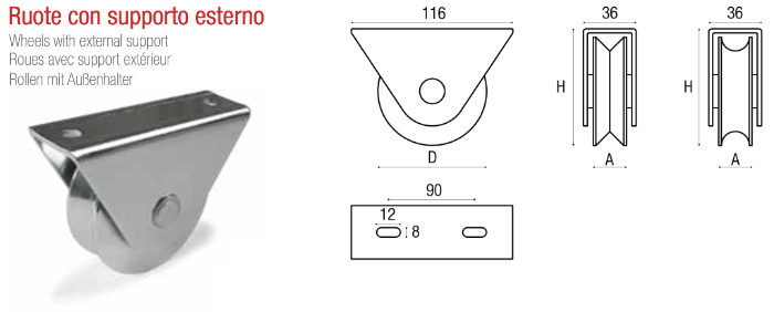 Wheel with external support for sliding gate, produced in various diameters by the company Adem. The capacity in kg varies according to the article.