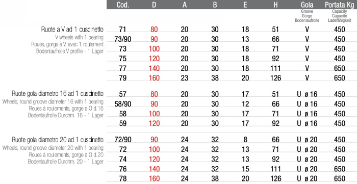 Wheel with snap support for sliding gate, produced in various diameters by the company Brevetti Adem. The capacity in kg varies according to the article code.